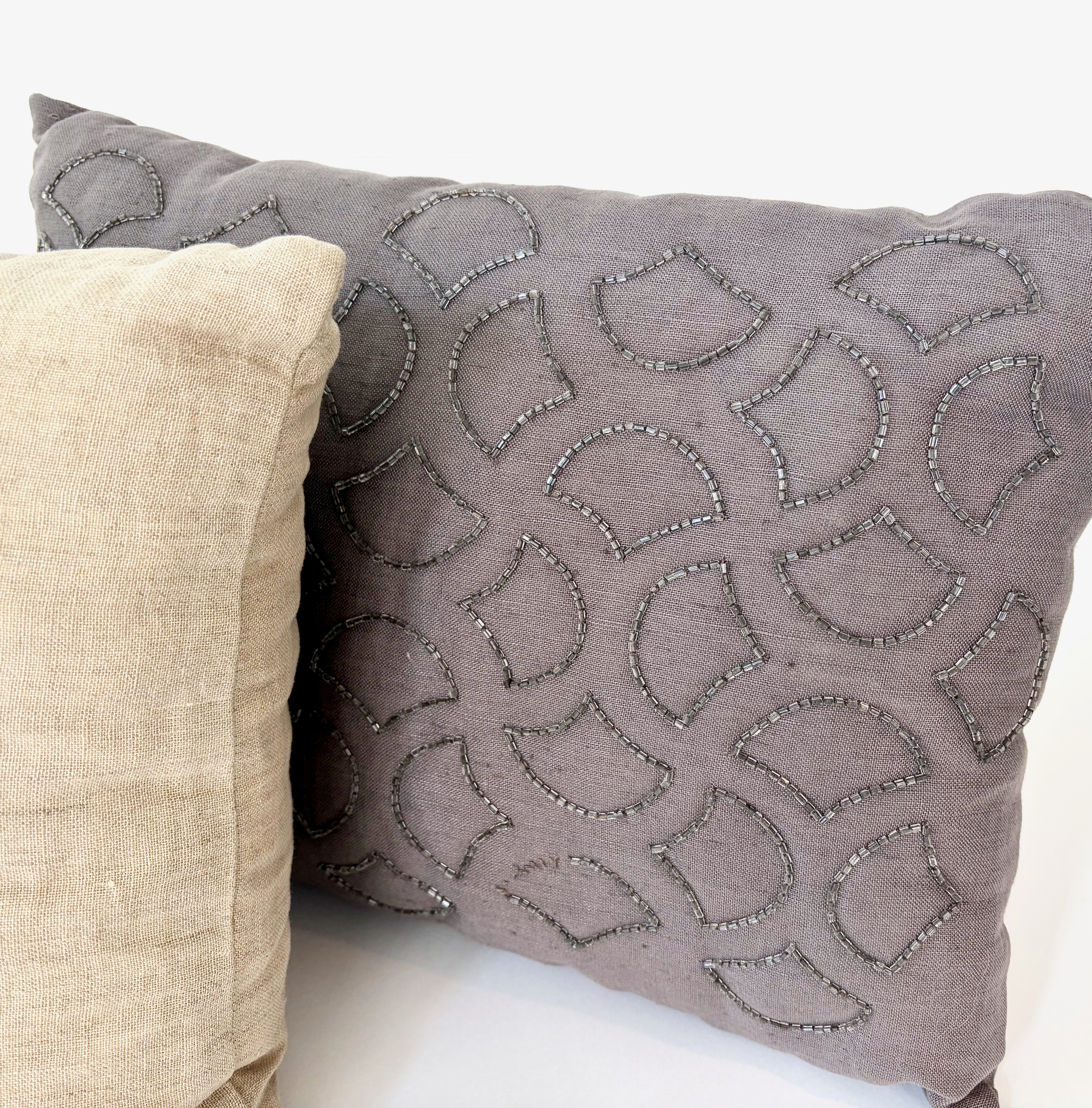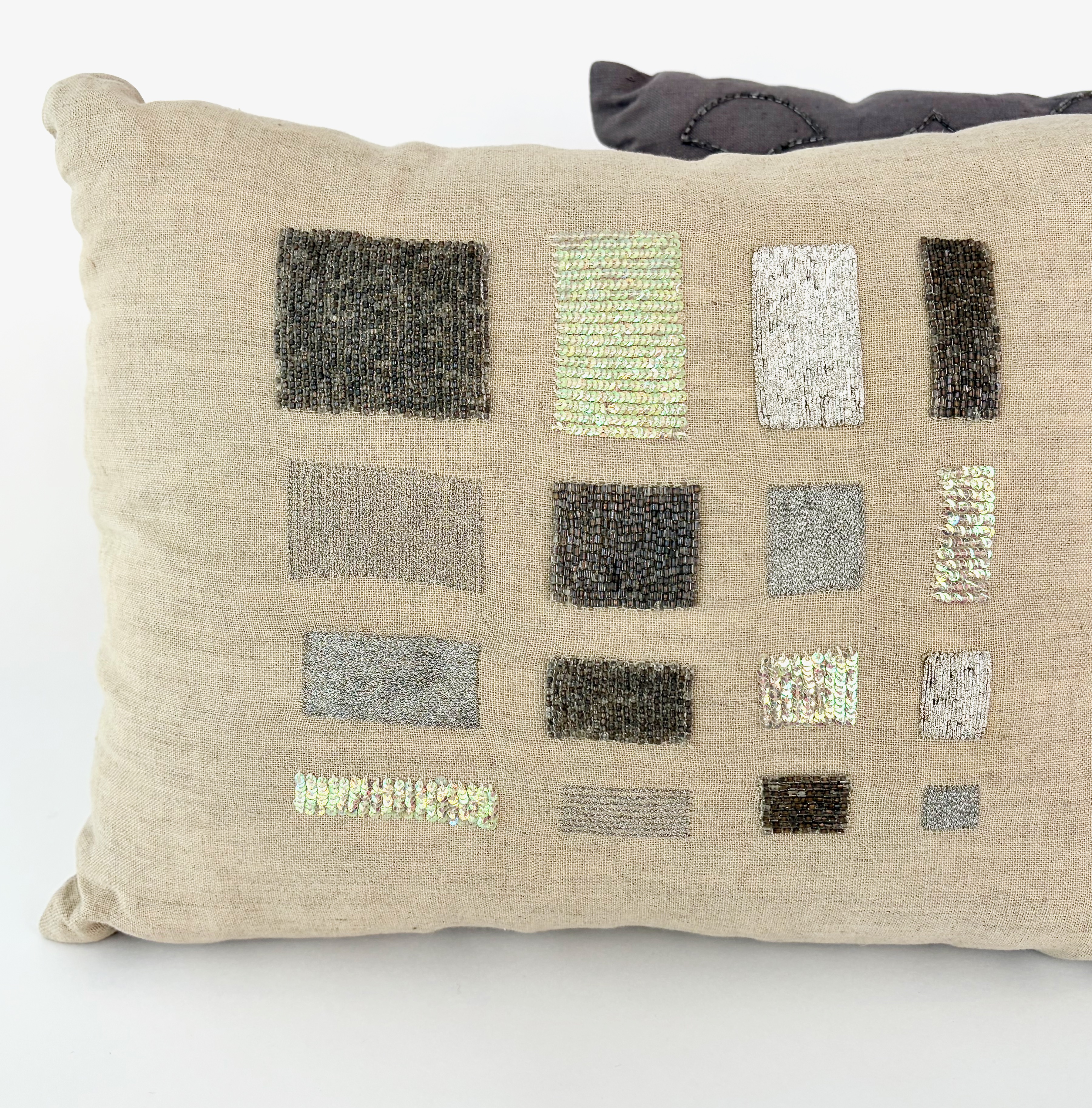 クッション BARNEYS ビーズ刺繍 リネン〈ピロー型〉 色:Light Beige / Purple